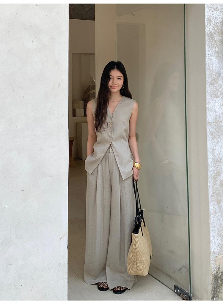 [Minimalist] V-neck Suit Vest + Wide-legged Pants Set (14% Lyocell, 6% Linen)