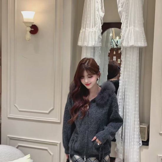 [Girly] 100% Wool Zip-up Sweater (Fox Fur Hat)